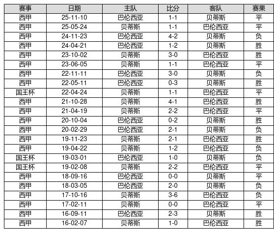 贝蒂斯 VS 巴伦西亚两队近10年的交战次数为23场,贝蒂斯8胜8平7负,赢球概率为34.8%,平局概率为34.8%,输球概率为30.4%。
