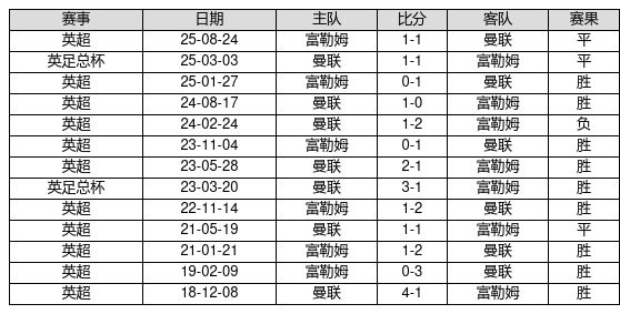 曼联 VS 富勒姆两队近10年的交战次数为13场,曼联9胜3平1负,赢球概率为69.2%,平局概率为23.1%,输球概率为7.7%。