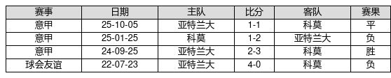 科莫 VS 亚特兰大两队近10年的交战次数为4场,科莫1胜1平2负,赢球概率为25.0%,平局概率为25.0%,输球概率为50.0%。