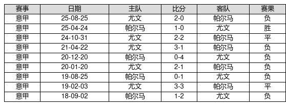 帕尔马 VS 尤文两队近10年的交战次数为9场,帕尔马1胜2平6负,赢球概率为11.1%,平局概率为22.2%,输球概率为66.7%。