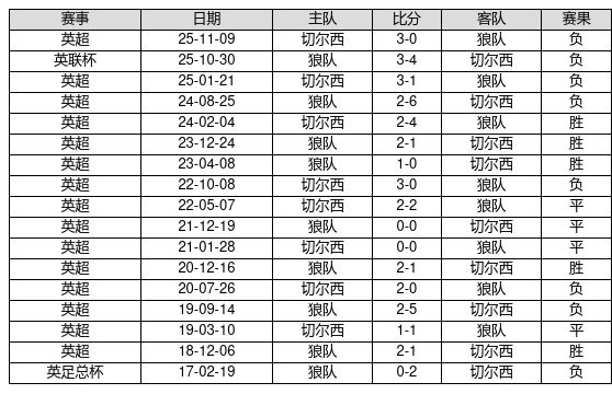 狼队 VS 切尔西两队近10年的交战次数为17场,狼队5胜4平8负,赢球概率为29.4%,平局概率为23.5%,输球概率为47.1%。