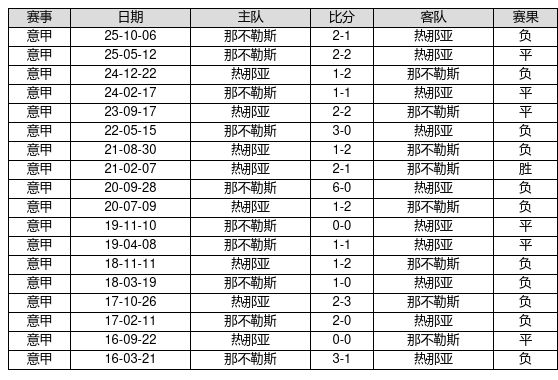 热那亚 VS 那不勒斯两队近10年的交战次数为18场,热那亚1胜6平11负,赢球概率为5.6%,平局概率为33.3%,输球概率为61.1%。