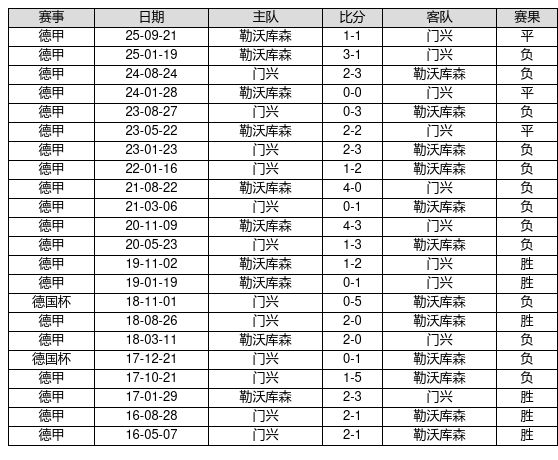 门兴 VS 勒沃库森两队近10年的交战次数为22场,门兴6胜3平13负,赢球概率为27.3%,平局概率为13.6%,输球概率为59.1%。