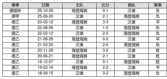 海登海姆 VS 汉堡两队近10年的交战次数为12场,海登海姆3胜3平6负,赢球概率为25.0%,平局概率为25.0%,输球概率为50.0%。