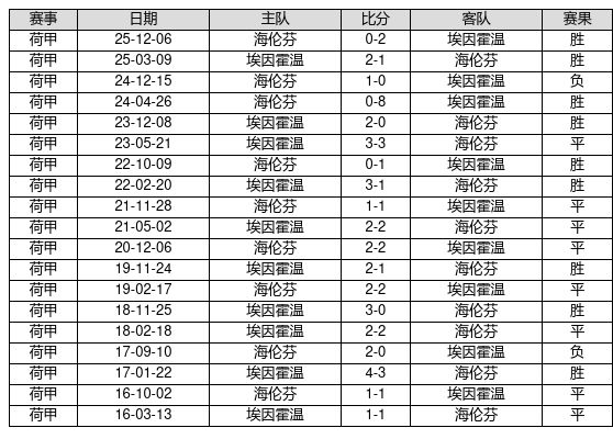 埃因霍温 VS 海伦芬两队近10年的交战次数为19场,埃因霍温9胜8平2负,赢球概率为47.4%,平局概率为42.1%,输球概率为10.5%。