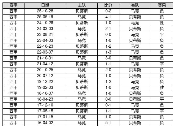 贝蒂斯 VS 马竞两队近10年的交战次数为20场,贝蒂斯2胜4平14负,赢球概率为10.0%,平局概率为20.0%,输球概率为70.0%。