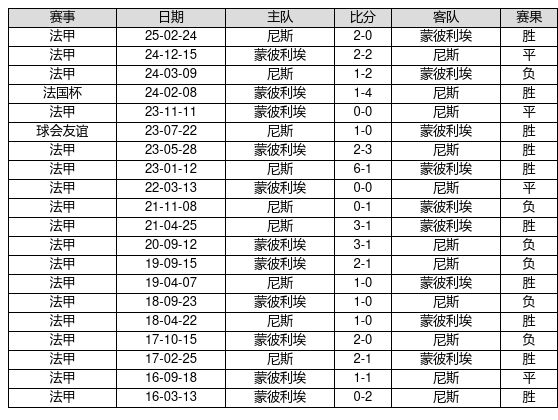 尼斯 VS 蒙彼利埃两队近10年的交战次数为20场,尼斯10胜4平6负,赢球概率为50.0%,平局概率为20.0%,输球概率为30.0%。