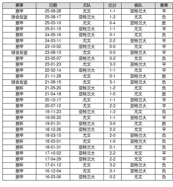 亚特兰大 VS 尤文两队近10年的交战次数为29场,亚特兰大4胜13平12负,赢球概率为13.8%,平局概率为44.8%,输球概率为41.4%。