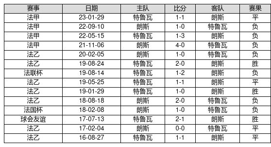 特鲁瓦 VS 朗斯两队近10年的交战次数为14场,特鲁瓦3胜4平7负,赢球概率为21.4%,平局概率为28.6%,输球概率为50.0%。