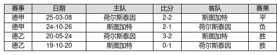 荷尔斯泰因 VS 斯图加特两队近10年的交战次数为4场,荷尔斯泰因2胜1平1负,赢球概率为50.0%,平局概率为25.0%,输球概率为25.0%。
